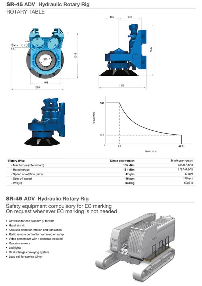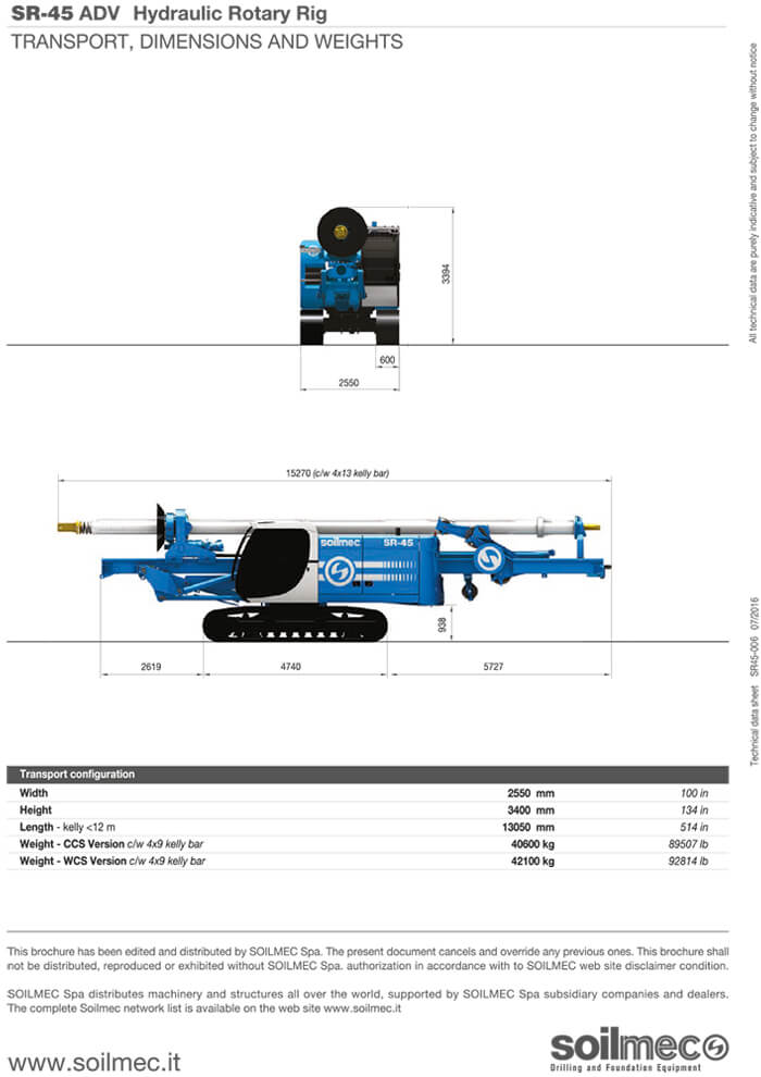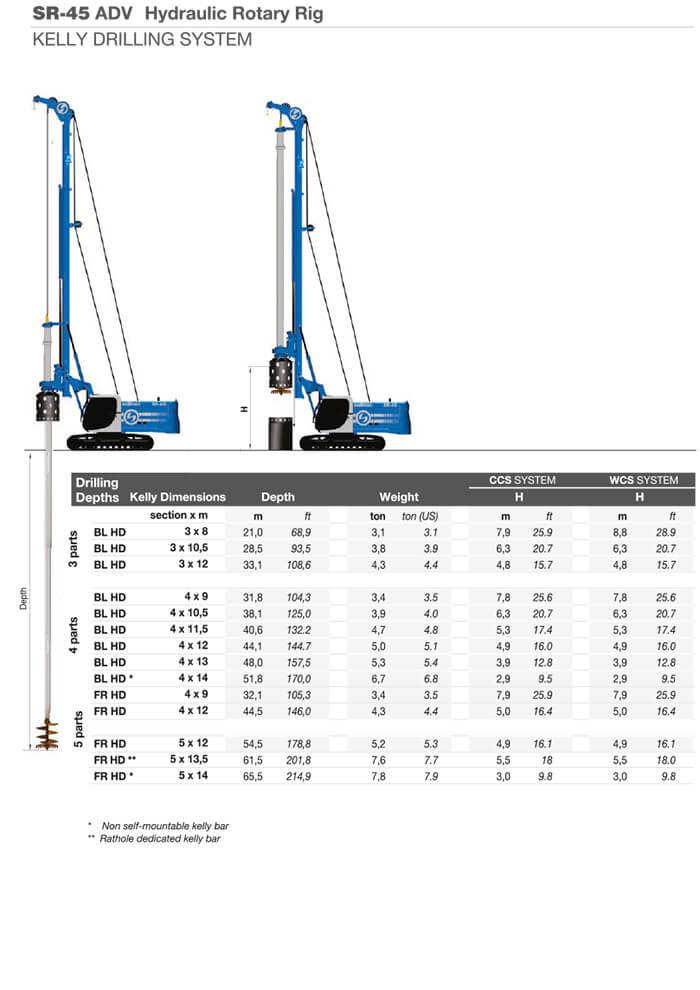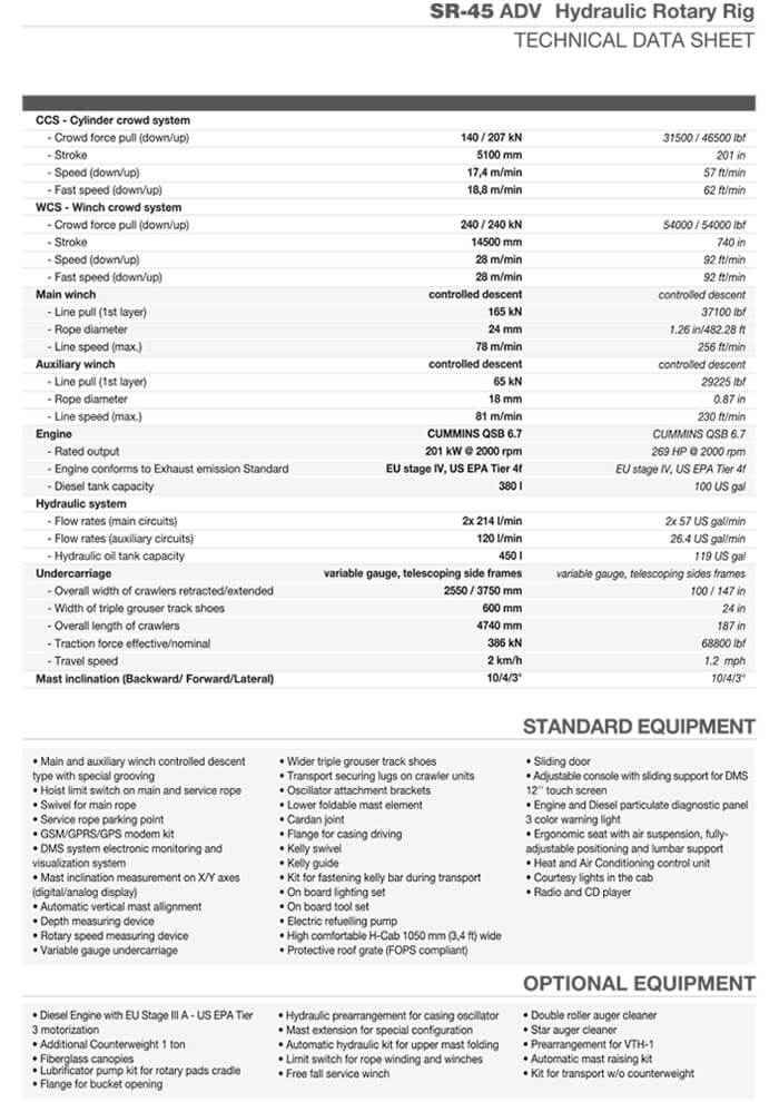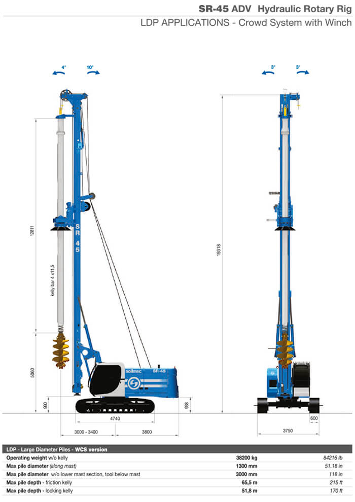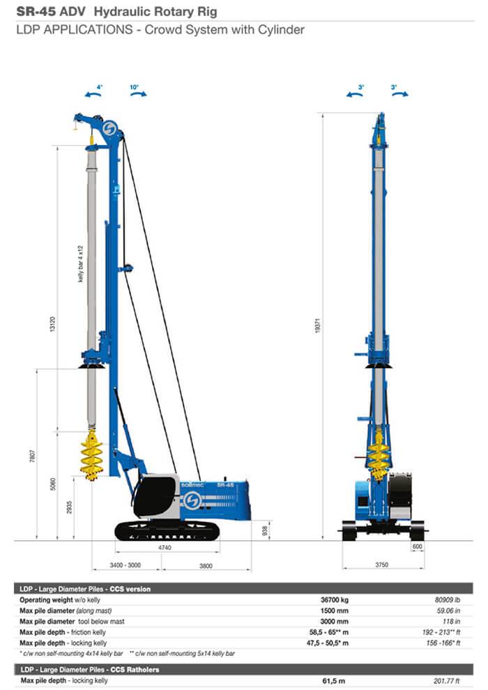 Può realizzare pali di grande diametro fino a 1500mm massimo e una profondità massima di 40m. Ha sufficiente forza per effettuare anche pali rivestiti. La SR 45 è dotata di cilindro pull down con spinta da 124kN e un argano principale con un tiro da 207 kN. La nostra perforatrice cingolata Soilmec SR45 per fondazioni speciali è equipaggiata con un kelly bar ad incastro 4×13 48m con attacco quadro 200×200.